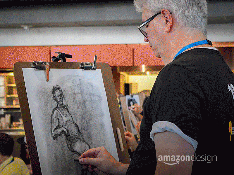 Drawing After Dark is a monthly figure drawing event sponsored by the Amazon Design Community & Amazon Expressions. Drawing After Dark fosters inclusivity across disciplines at Amazon, open to all badged employees.