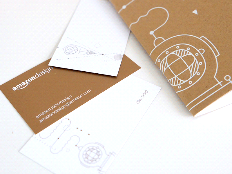 A set of business cards and sketch book we designed for the UX community events at Amazon. Each card highlights our leadership principles: Dive Deep, Think Big, Deliver Results with whimsical illustrative graphics.